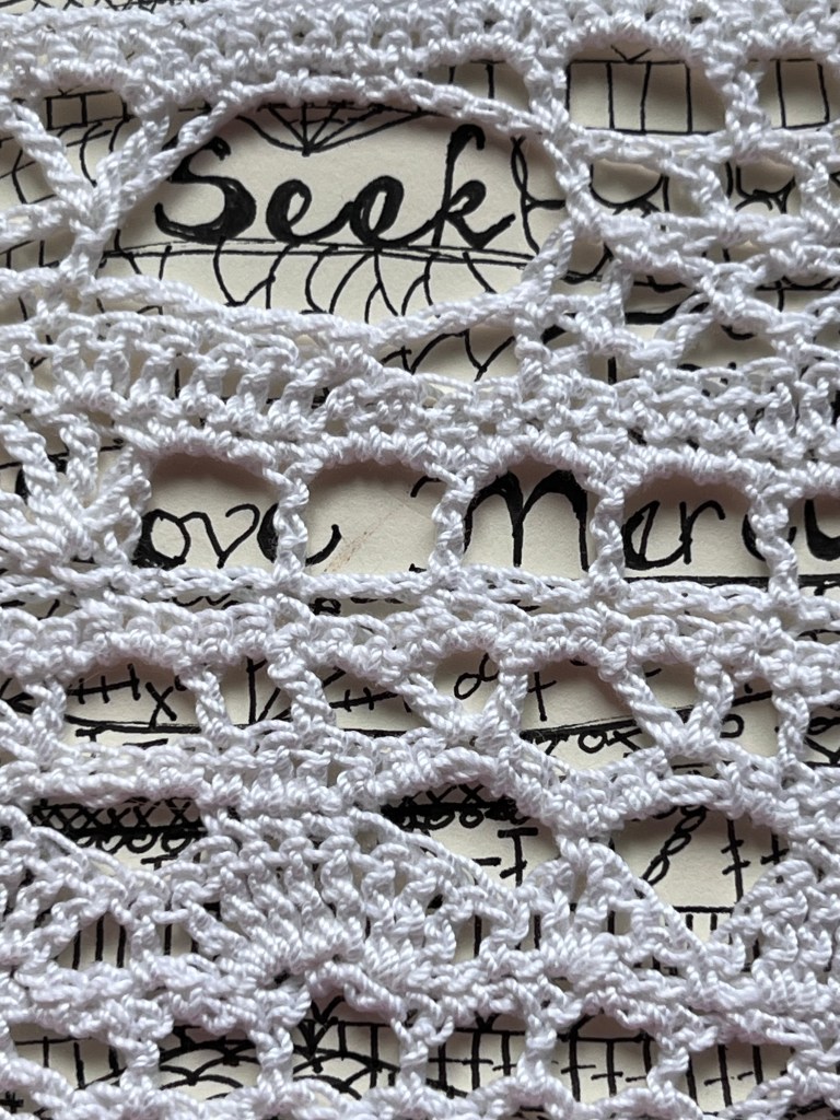 Every single piece of crochet lace was made with very fine thread and tiny steel crochet hooks. Hours upon hours were spent making something that, at the time, was a thing of beauty in someone’s home. I want to challenge makers and artists to rethink their opinion on doilies and all forms of crochet lace. How can it be used in modern artistic applications? I believe that using the work of someone’s hands from a previous generation to create something new is an honorable pursuit.