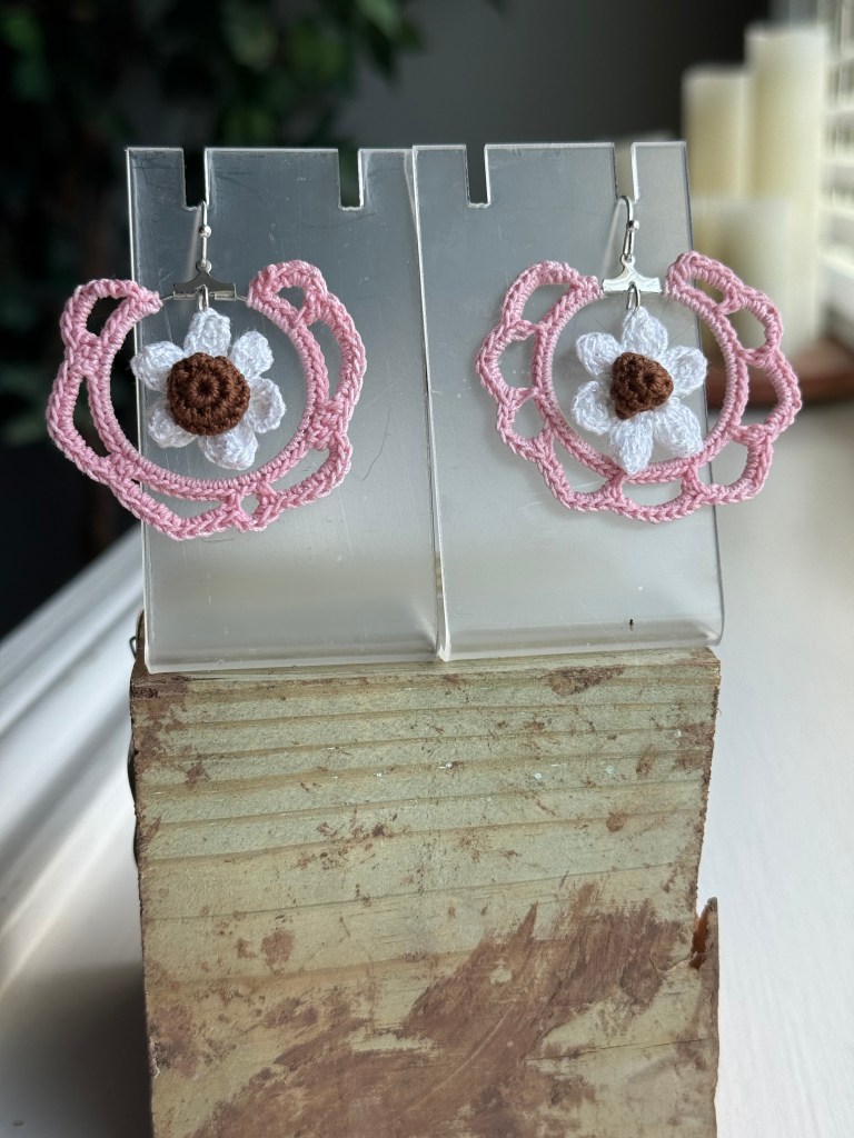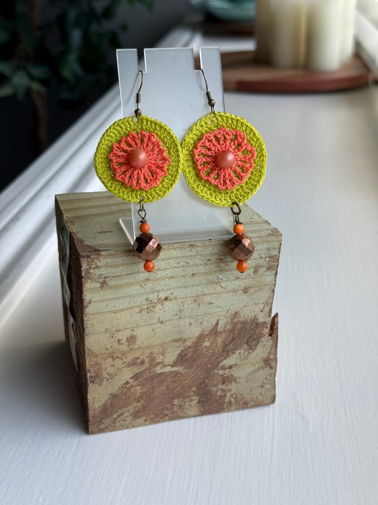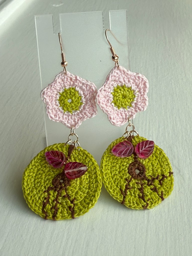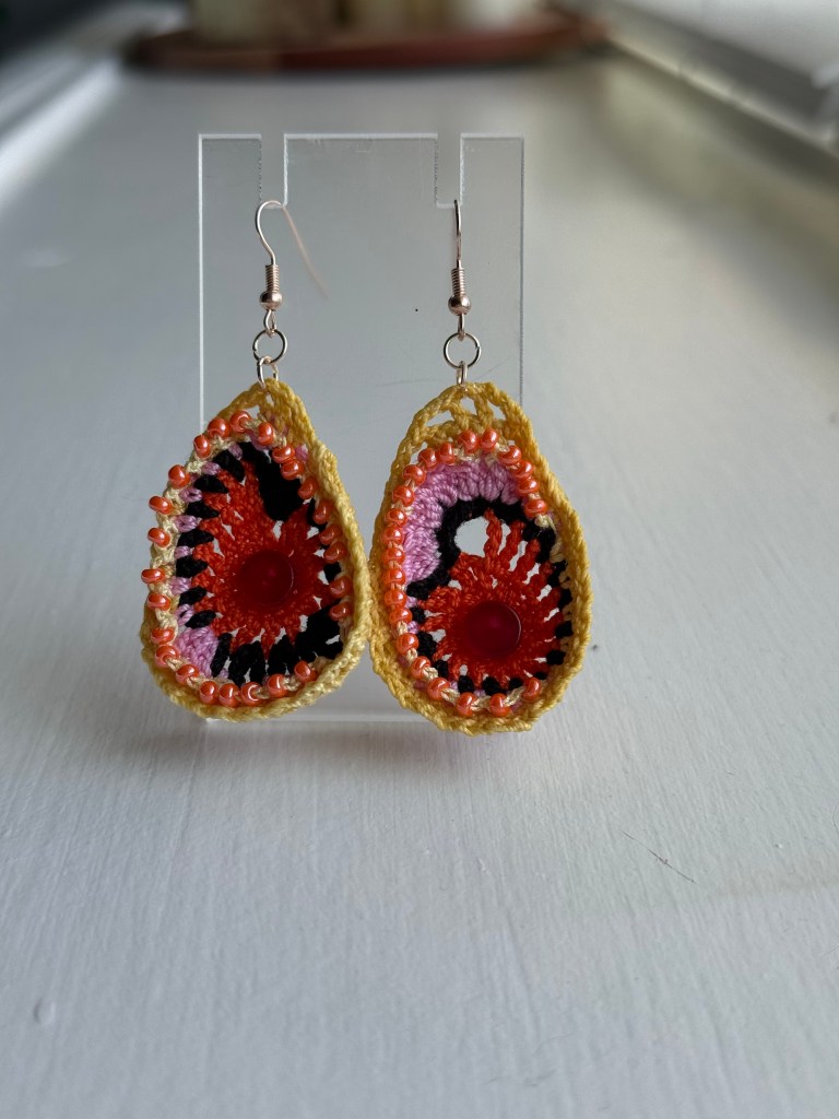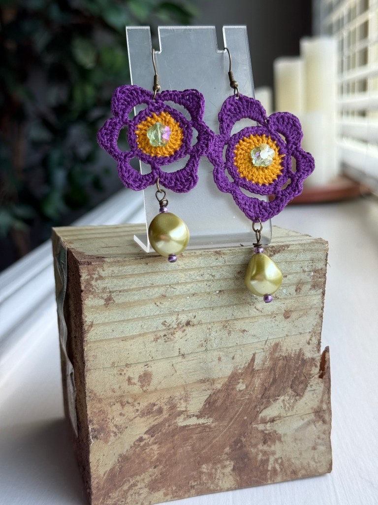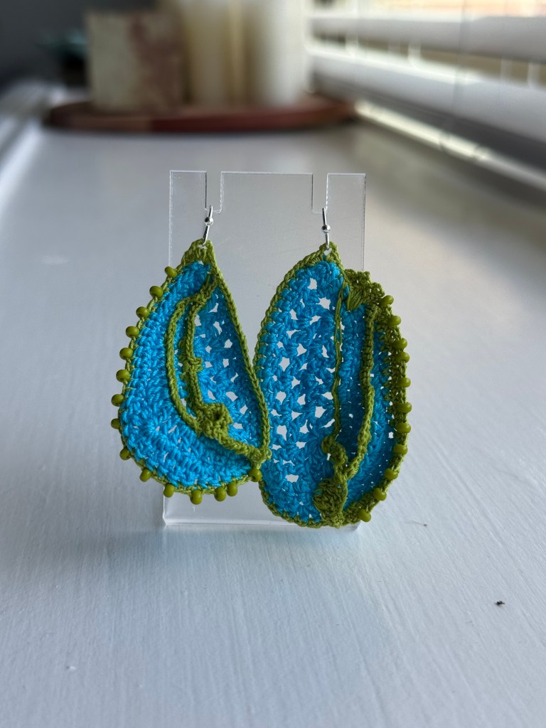 I just returned from a five-day trip to Allegan, Michigan where I worked with my friend in his yarn shop during the Michigan Fiber Festival. The Bear and Fox Yarn Den is a fabulously cozy and fun shop to spend time looking at yarn and all the goodies they have to sell. Among the items for sale, my first collection of hand crocheted earrings are available. They were warmly received, and two pairs sold while I was there. It is a very exciting feeling to have my work so warmly received.